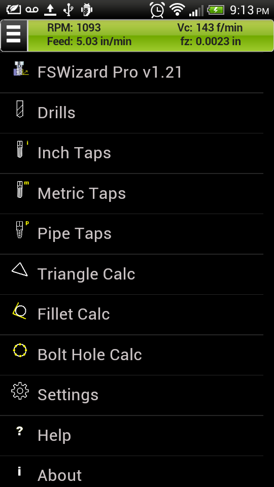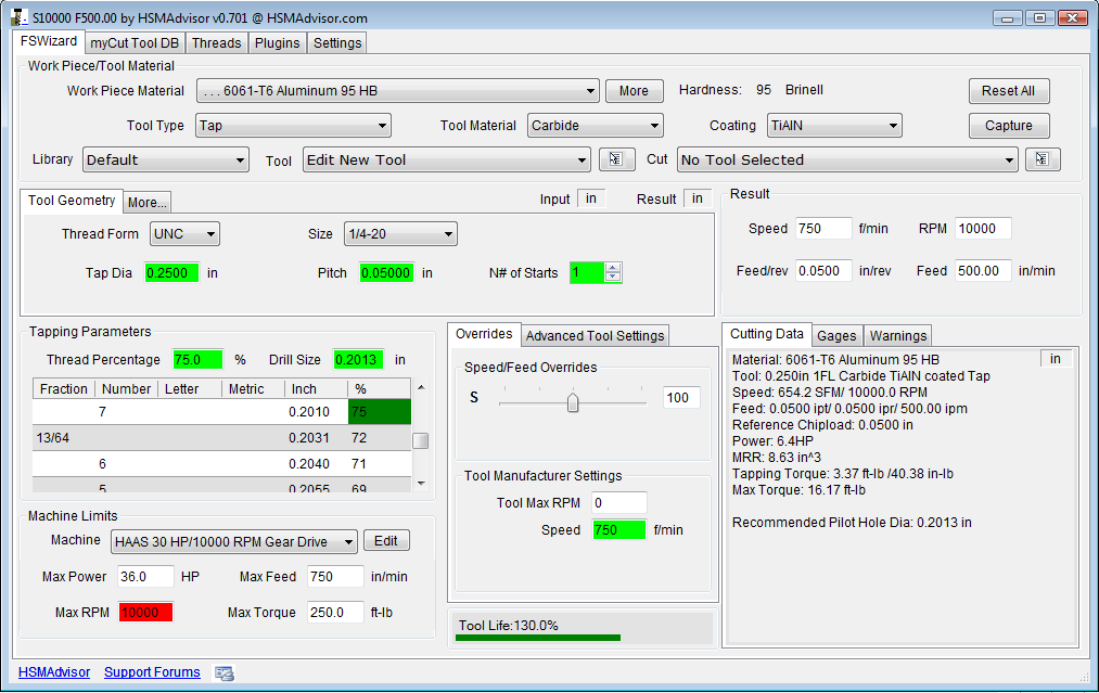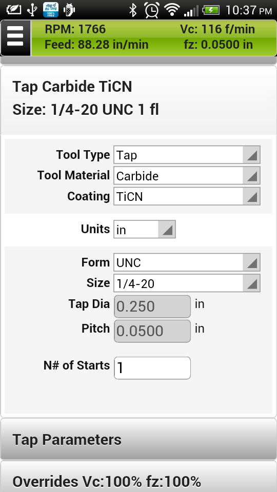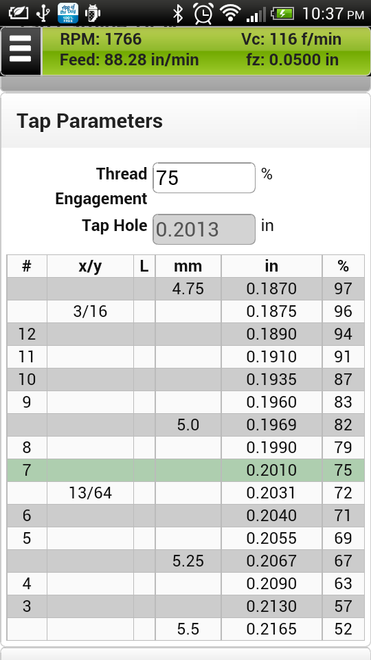 You can now get not only cutting speed and feedrate for taps, but also calculate the best drill size for desired thread percentage.