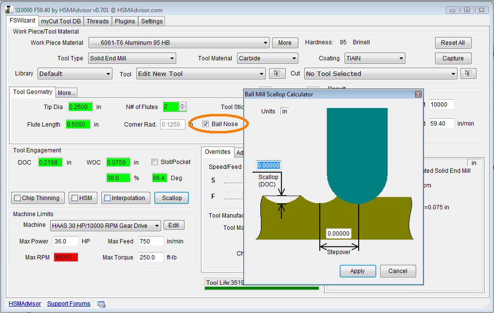 • Scallop calculator has been added for ballnose type endmills