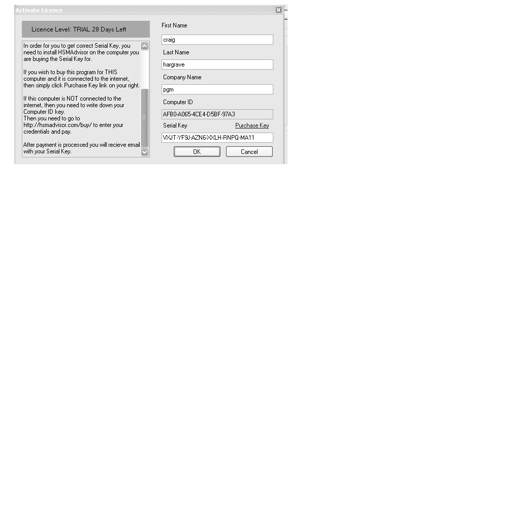 Lol i must have misspelled something when was entering your original info because the license key IS different. Try this. First Name:craig Last Name:hargrave Computer ID:AFBO-A065-4CE4-D5BF-97A3 Serial Key:XFLM-XC6P-BMXJ-RWMM-YQ80-SA11