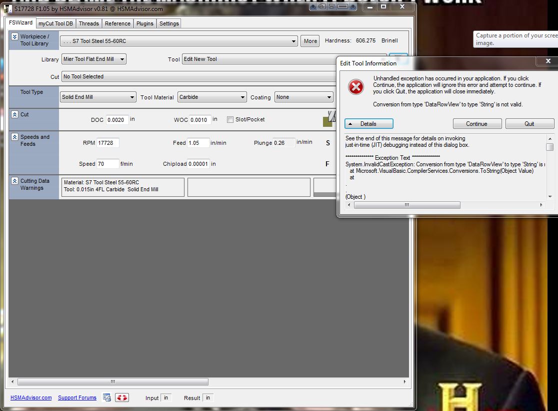 Eldar, This morning I went to add a new tool and the software came up with an error that would not allow me to add a new tool. I would do a screen capture of the error. but I can't resize the error information toget it all on one capture so here is just the top of it. Any help would be appreciated. Steve L.