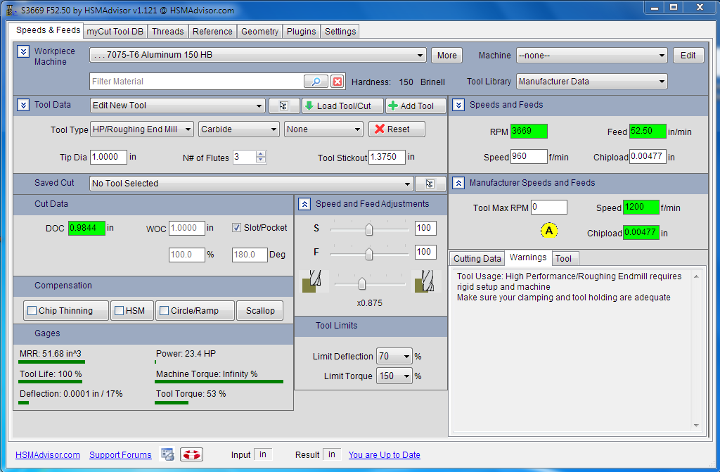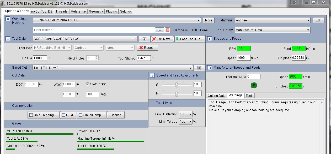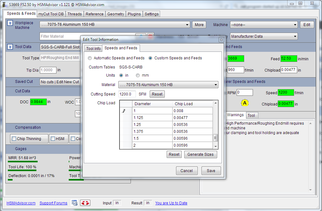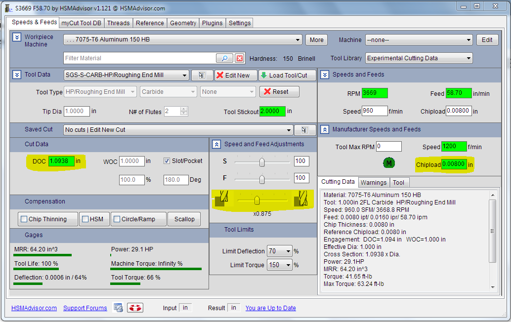 Trying to get the hang of and understanding for the software so sorry if this is obvious. I have set up a tool using manufacturer data. I then set up a cut to slot 1xD (per mfg data). I notice that the sfm and chip load are different than the manufacturers data. I am wondering where this information comes from and how it is calculated. I also notice that the chip load is adjusted for lower radial cut even when chip thinning is not checked. I will leave my confusion with that for now. ;)