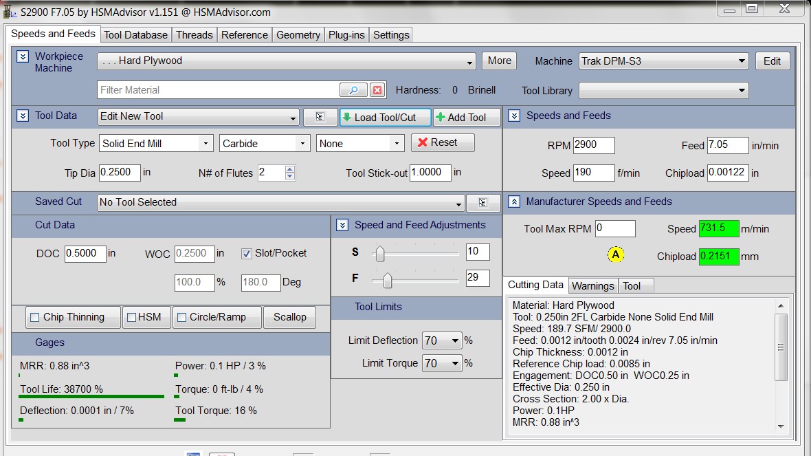 Did f/s for a profile and get ~ .001 chipload for various cutters and parameters. Seems awfully low for wood. Setup below; I don't see any other limiting factors that should make it so low.