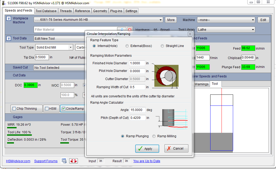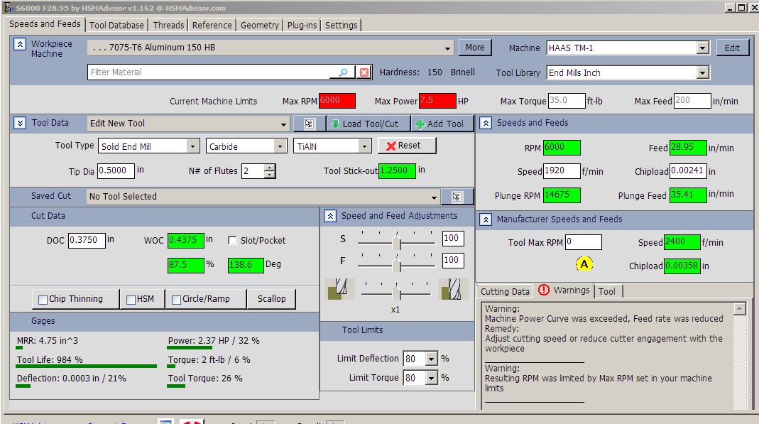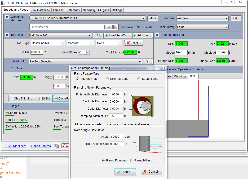 Hi again Eldar, Nuther question :) Using the Circle/ramp calculator is is showing a plunge rate higher then the cutting feed rate and also at a RMP much higher then the available RPM set in the machine specifications. Changing the high RPM to the available rpm makes no changes to the Plunge feed rate. Also click from 1 thru 4 flute with these setting and look at the chip load and feed rates, just does not seem correct, but I'd be the first to admit, "What do I know" :) Thanks Ken