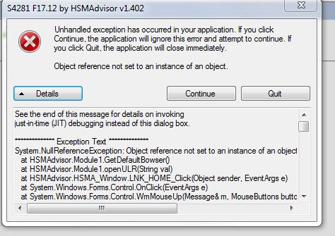 Thanks Eldar, It's not really a problem for me. If you hit the continue button on the error message the HSMadvisor works fine, I can't access the support forums or anything using the bottom icons. I have to open my browser and go to HSMadivsor to look at the help and forums. Steve