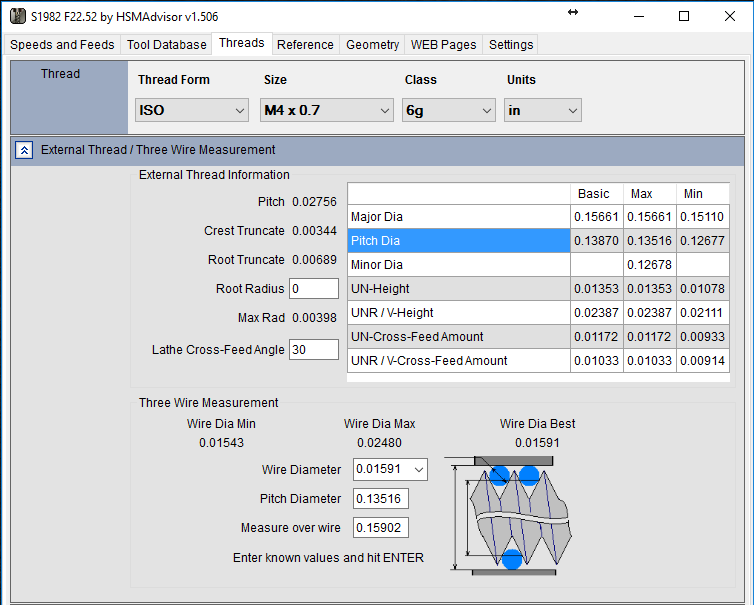 Is there any documentation on what the "threads" tab is supposed to show and how to interpret the values? I can select some common threads at the top. For external threads I can see major and minor diameter, however with no unit. (I would estimate that it would be millimeter and I configured by HSMAdvisor to be metric.) I can not see the thread angle. (Not all threads can be milled with a single point 30° cutter.) I can not see anything that I would understand as a pitch distance to write a G31 command for milling that kind of thread. For internal threads all that information is milling and the information shown is pure glibberish to me. For people milling threads only ocassionally, some chart like at http://theoreticalmachinist.com/Threads_UnifiedImperial.aspx would be helpfull here.