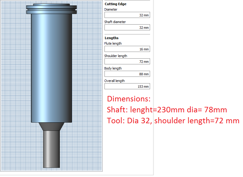 Hi, I'm still testing your software and I really like it. However, tool deflection can;t cope with some of my tasks. I tend to do a lot of work in welded parts, using tools with long stick out. For example - 32 mm indexed endmill with 80mm shoulder length mounted on long Weldon 32 shank with A=230mm and diameter of 78mm. To describe this tool I would need flute length(for the length of carbide insert), shoulder length for the length of the tool before Weldon shank, and shank diameter and tool stick out for this Weldon shank. First thing - tool visualization counts shank diameter as only upper diameter and supposes that lower diameter is the diameter of the tool - this makes shank a cone rather than a cylinder which isn't correct in my case. Would you consider adding lower and upper shank diameter? Second, it doesn't count shoulder length into tool deflection calculations which give unreliable feeds and speeds for those kinds of long stickout applications. Other than that, for regular stickouts, I think your software is very good. Especially tool management is much better than in G-competitor I have also trialed ;)