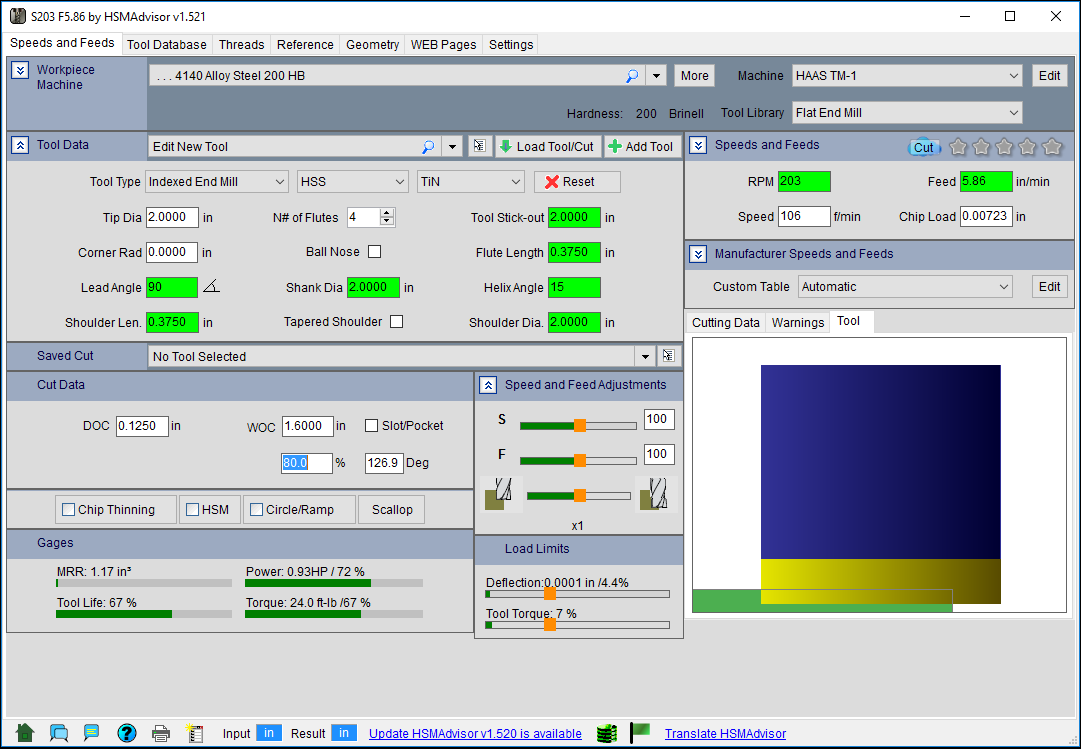 I might be looking right at the answer and just not seeing it in the software but, I'm not really sure how I'd enter or select this particular type of cutting tool. Filling out all of the other text fields is fairly simple in order to get the Feeds and Speeds I'm looking for but without entering the specific cutting tool correctly it's hard to proceed any further and expect the software to generate the correct cutting calculation. How would you go about entering this type of tool as your selected cutting tool. I'm sure the answer is a simple one; I just don't know what the answer is. I've filled in the pertinent text fields using, 2" as my diameter and four flutes as the number of flutes and HSS Tin coated insers as the material that the cutter is made of but I can tell by looking at the numbers being generated that my mill will bog down if I use them. I tried running it using those ultra low feeds and speeds and it did in fact bog down to a stall. I've also actually tried the trial and error method of tweaking my Feeds and Speeds and I can get it to work but I'd feel more comfortable allowing HSMAdvisor do its work by correctly entering the description of the Shell Mill I'm using. As it is, the numbers I originally generated by entering a 2", 4FL HSS TIN Coated-Inserted end mill are not even close to the numbers I had to tweak it to in order to give me a half way decent cut or surface finish. I know this software will do better because it does it all the time when I use conventional end mills. I just don't think the tool description I'm using is correct for the software to understand. Any suggestions?