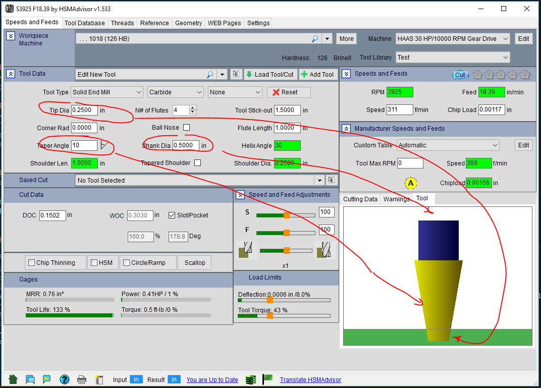 Hi, There is no special "Tapered End Mill" tool type. Rather is is achieved by entering a "Taper/Lead/Tip" angle value. You can click on the angle icon to change the type of angle you are entering. Tapered tools are calculated according to the parameters entered, so it is important to specify actual geometry. Please check the attached screenshot for reference. Best regards!