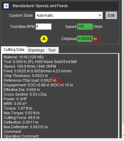 Elgar, Thank you for the quick response! On clicking the "Chip Load" dimension, it would change the dimensions of Feed but not ReferenceChipLoad. However, toggling the Input at the bottom of the HSM window got the change made. That gets me going. Thanks for a good, useful product! Bruce