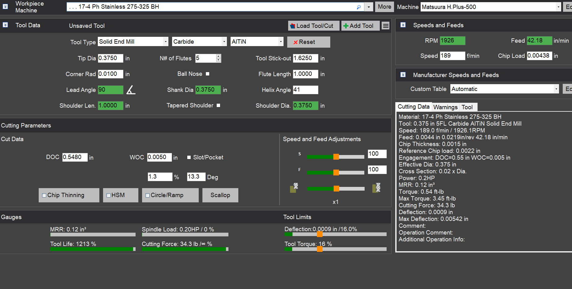 Hi, Yes, you are right. The Speeds and Feeds are suggested for medium roughing operations. One way to select finishing is to: * Turn Performance Slider to the minimum * Set the feed rate override to 50% * Enable HSM checkbox But I believe you as a machinist would have a better idea in regards to finishing feed rate depending on your finish and tolerance requirements. I tried to add the "Finishing button" feature based on the recommendations above but it just looks like too broad of a rule of thumb and it does not work in all cases. So it is still up in the air. Best regards.