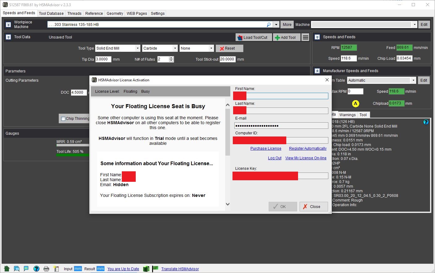 One way this could happen is if you stop using HSMAdvisor on one PC and then start using it on another PC less than 10 minutes later. This causes the "Seat is Busy" error. In my logs I see that happen last time on February 1st Please confirm this is what is happening.