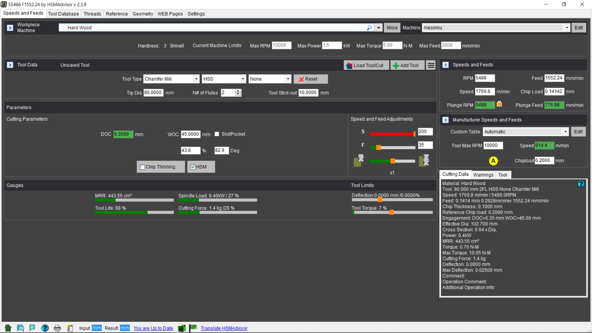Hi, I still don't understand how do you calculate max torque and deflection? There is no information about the diameter of the shank, so it is impossible to calculate the strength of the shank and its deflection. I input tool data directly, do not use databases Another question, why the speed bar slide is red even though it is still far from the speed limit of HSS on hardwood (2000m/min vs >120000m/min as recommended tools Vendor).