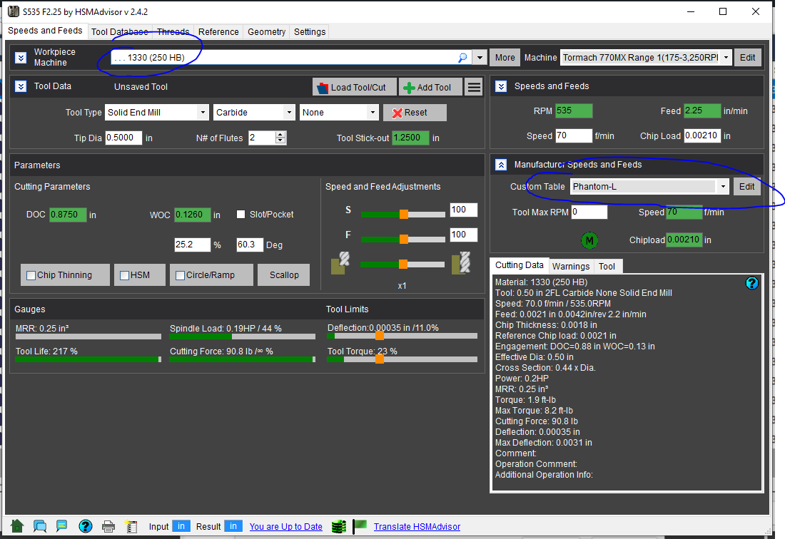 In fact, the way you use the custom tables created in the list box of the dialog are almost usable except you shouldn't modify the surface speed and the series name. In fact I don't really get the purpose of these custom tables since the dialog itself already has chip loads in its own table. The more I think about it... these custom tables can do the trick if and only if : no cutting speed and series name are overwritten.