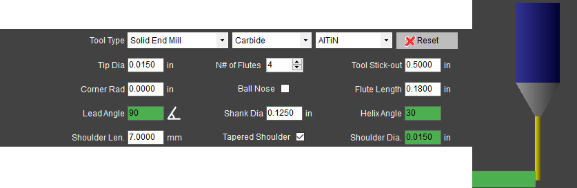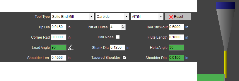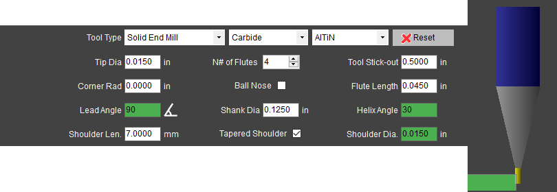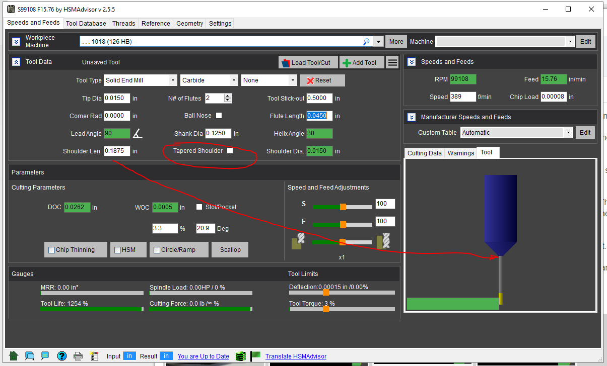 I'm just getting started with HSMAdvisor and I like what I see so far. I did have a few questions about entering a particular long reach tool, though. I've got this tiny 0.015" Harvey Tool 992515-C3 endmill (see attached endmill.jpg), which has 3xD flutes and 12xD reach. I measured roughly 7mm for the length of the shoulder. Since there isn't an extra field in HSMAdvisor for reach, entering everything exactly from the datasheet (along with the 7mm shoulder I measured, which isn't listed in the specs) gives a tool that isn't correct. (See attached 1.png) The first workaround was to lie about the flute length and just enter the total reach instead. (Is this the correct procedure?) That gets things closer (see attached 2.png), but now the shoulder doesn't look right anymore. My guess is that the "should len." field isn't just for the tapered portion, but instead it's the full distance measured from the end of the mill to the back of the shoulder. Entering reach+shoulder (or 0.18" + 7mm) for the "shoulder len." field finally gave a simulated tool image that looked correct. (See attached 3.png) So, I suppose for my final question: is manually adding those two numbers together really the right answer or am I missing another box someplace or doing something else wrong? Thanks!