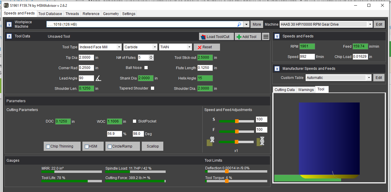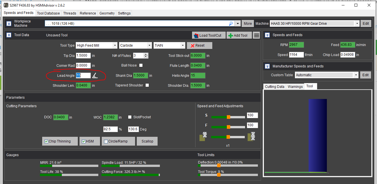 Здравейте, Използвам Google Translate, за да чета и пиша на неанглийски езици, така че прости ми, ако нещо не е наред. HSMADVISOR поддържа резачките за бутони с кръгли вложки и крайни мелници с високо хранене. Моля, проверете екраните по -долу. Моля, обърнете внимание и за двата типа инструменти дължината на флейтата е максималната препоръчителна дълбочина на рязане според вашия производител на инструменти. Също така за крайната мелница с високо хранене е важно да настроите правилния ъгъл на олово според вашия действителен инструмент. В близко бъдеще ще добавя специален край на лицето с кръгли вложки. Hello, I am using google translate to read and write in non-English languages, so forgive me if something is wrong. HSMAdvisor supports the button cutters with round inserts and high-feed endmills. Please check the screenshots below. Please note for both tool types the flute length is the maximum recommended depth of cut according to your tool manufacturer. Also for a high-feed endmill, it is important to set up the correct lead angle according to your actual tool. I will be adding a dedicated face endmill with round inserts in the near future.