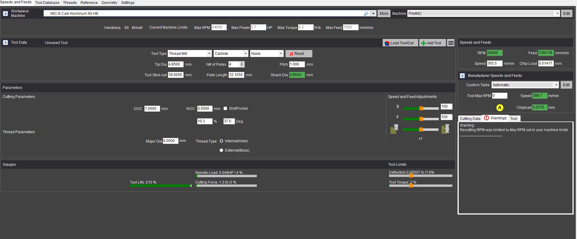 Trying to get feeds and speed for threadmilling. I have a few questions. I've entered MIC-6 Cast Aluminum as the material (since there isn't an option for ATP-5 tool plate). I'm doing a 6mm thread. 1mm pitch. 4 flutes and a single point (thread). Tip diameter is 4.85mm. 1) I've set DOC to 1mm since it only cuts one thread at a time and the depth of one thread is the pitch. Correct? 2) The distance between the the minor diameter and the major diameter is also about 1mm. Since this is being cut with a helix and only half the material is removed from each side of the cut, I've divided the cut in half and set WOC to .5mm. Correct? The recommended Speed is 24K RPM (limited by my spindle speed). My vendor recommend a lower SFM, so I will adjust that downward (don't think it's relevant to these questions). 3) The recommended feed provides a chip load of .014 mm. This is only half the minimimum chip load recommended by the vendor. More relevant, it's less than 1/2 the chipload shown in HSMAdvisor's Manufacturer Speeds and Feeds (shown as .0370 mm). I'm confused about why the displayed manufacterer feed rate isn't being recommended?