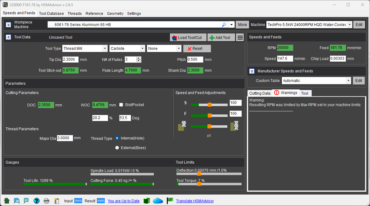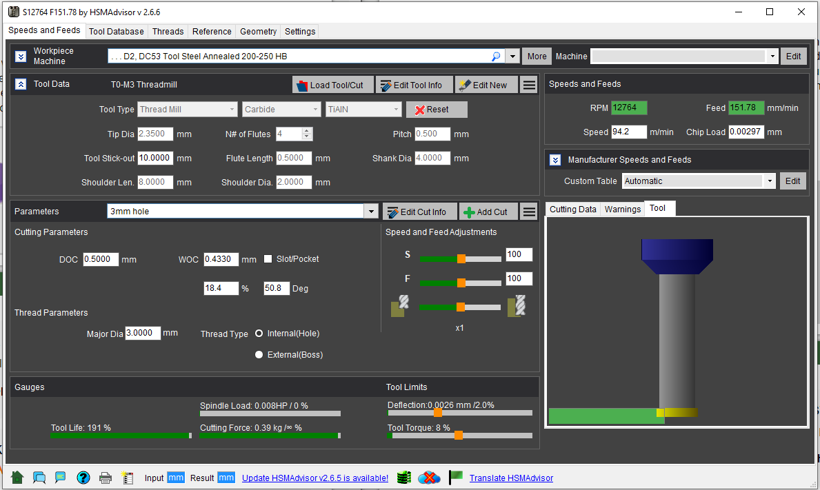 Hello, 1. I can't tell you whether 20000 RPM is too high or too low because you didn't specify the material you are machining. Cutting speed-wise, calculations should be almost the same as for sold end mills. 2. When you reduce the shank diameter, HSMAdvisor reduces the suggested WOC, which in turn allows for increasing the feed rate, due to the reduction of engagement.... To prevent that from happening manually enter the DOC and WOC values: DOC = height of the teeth. in your case that would be 0.5mm WOC= (thread_dia - pilot hole) / 2 Please see below for the suggested tool setup. (The latest HSMAdvisor v2.6.6 shown)