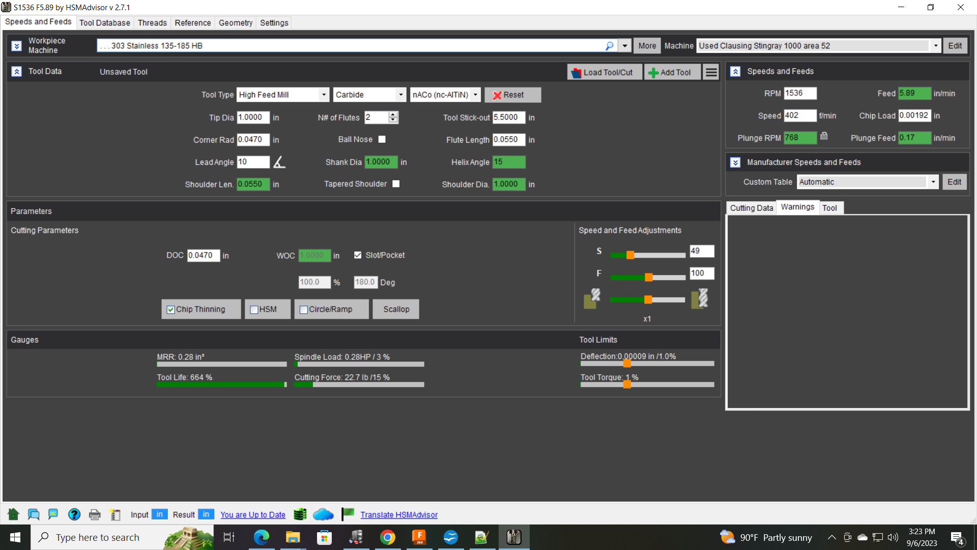 Hello, I am using HSMA to get the speed and feeds for a high feed end mill in HSMAdvisor. I put the tool geometry in, chose High Feed End Mill and chose the correct specs for the end mill. But when I check chip thinning, it doesn't appear to be calculating or applying axial chip thinning. I plugged the same tool, material and parameters into FSWizard and I get 5.7 as the axial chip thinning for the comparable cut. Can you advise? Ryan.
