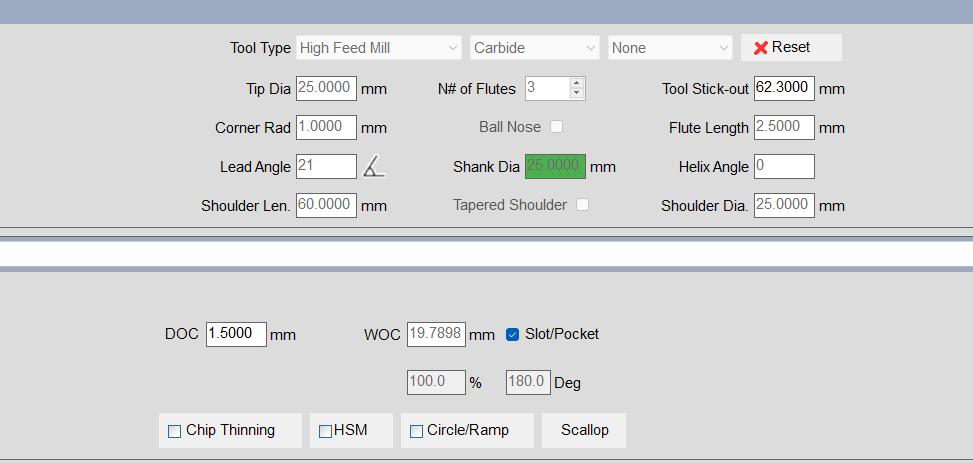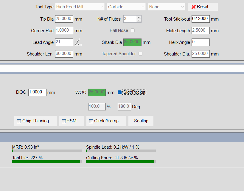 Hi, 2.5mm flute length seems very high for a HFM. For Feed mills the flute length is the maximum cutting depth. Also what material are you calculating it for? You are not going to see exactly the same values as suggested by your manufacturer because there is a lot of variance between different tools. From the little that I can see on the screenshot it looks OK. Best regards.