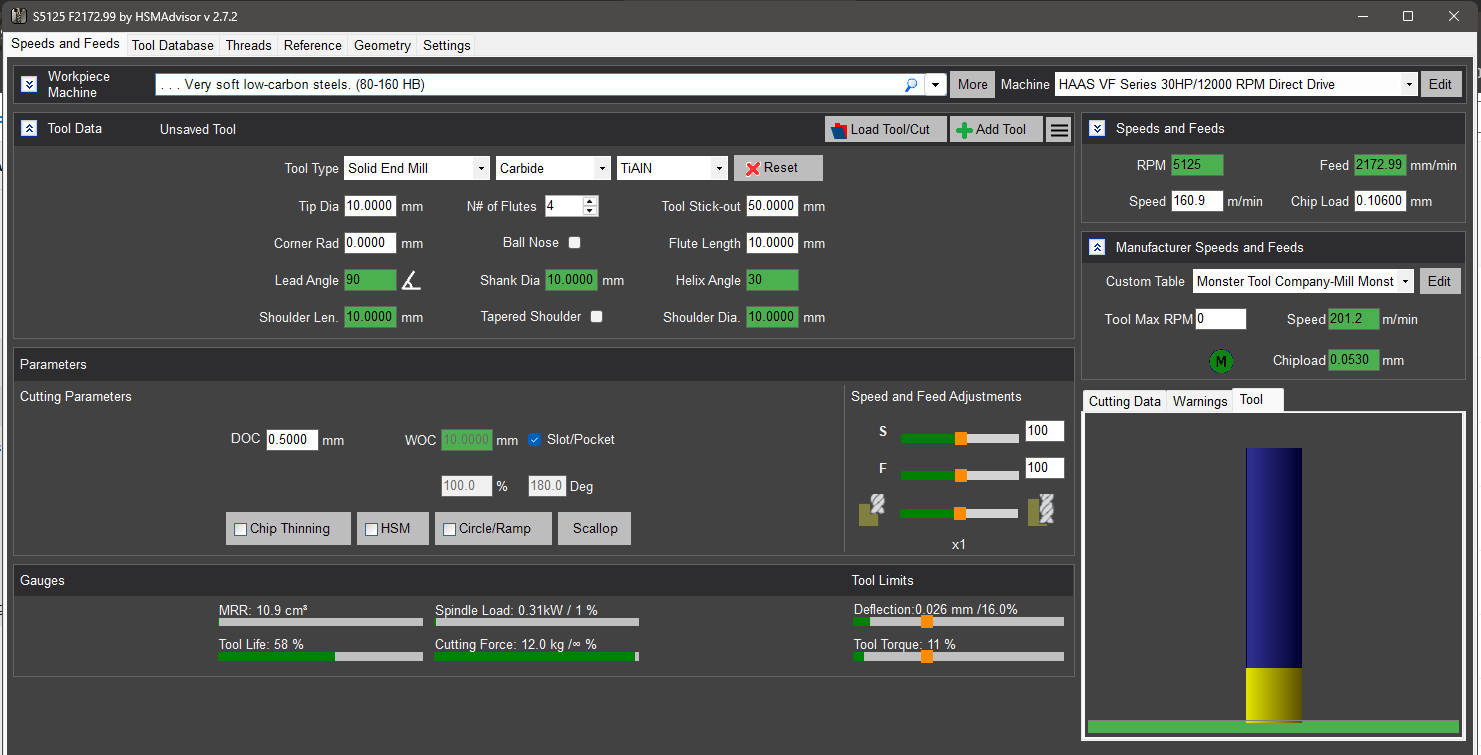 The 10 mm tool has a chip load of 0.055 mm.